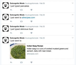 This is a browser extension for Chrome that basically just tweets every site you visit and everything you type. For now, it only shares information via the official Twitter account, @outcognitomode, but creator, Harold Cooper, says in the future it’ll be able to connect to any account of your choice. Pretty cool, yeah? Maybe not.