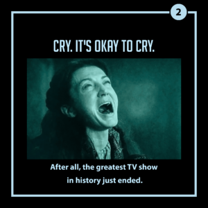 2. CRY, It’s okay to cry: Trust me, you have nothing to be ashamed of; just let it all out. At the very least, you can be assured that you will not be the only human alive crying for this reason. After all, the greatest TV show in history just ended.