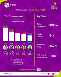 Maria, Pere, Angel, and Whitemoney are among the top five most talked about housemates yet again. On Tuesday, August 10, 2021, about two hundred and fifty-four thousand social media posts centered around BBNaija and the drama going on in the house ended up generating seven hundred and nine million digital impressions.