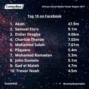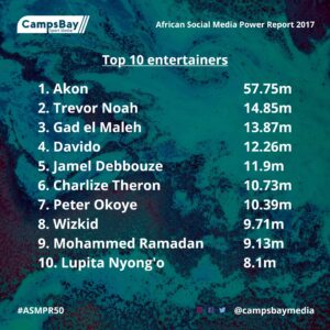 “In a world where social media continues to play a big role, the influence of African entertainers and footballers, the crème of popular culture on our continent, continues to fascinate and that is why we have compiled this list,” said Lolade Adewuyi, chief strategist at CampsBay Media.