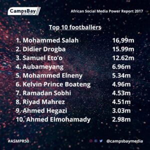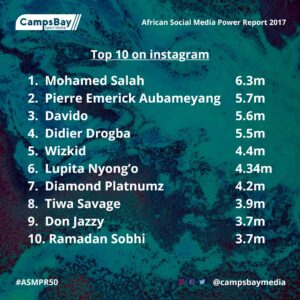 The report also includes a list of the top 50 African footballers and top 50 African entertainers on the three social media platforms in the full report that can be downloaded on their website: www.campsbaymedia.com.ng