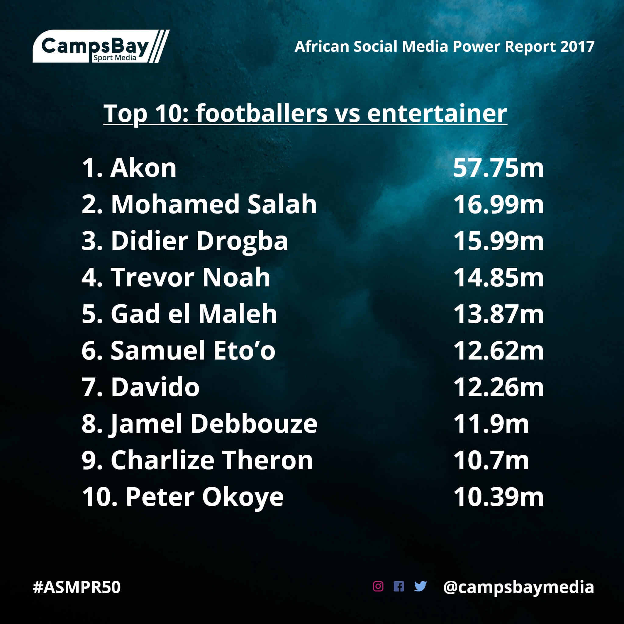 “In a world where social media continues to play a big role, the influence of African entertainers and footballers, the crème of popular culture on our continent, continues to fascinate and that is why we have compiled this list,” said Lolade Adewuyi, chief strategist at CampsBay Media.