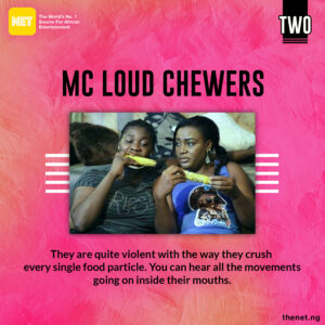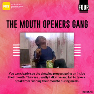 You can clearly see the chewing process going on inside their mouths when they chew. They are usually talkative and don’t understand the words, ‘pause’ or ‘stop’. So while they eat, they serve you some hot gist and open every part of their mouth as they chew. *Cringes*