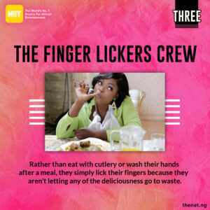 These ones haven’t finished eating their meals except they leave their plate sparkling clean. They mostly use their index finger to clean up the plate, lick the finger, then proceed to lift their plate and lick it with their tongue, very skillfully. This makes them close associates with the finger lickers.