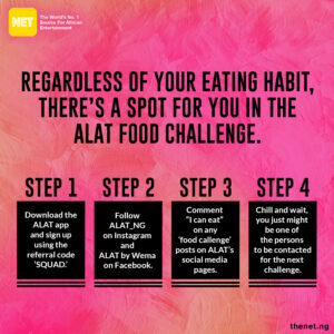 Show up unbothered and ready to be crowned the ultimate foodie who will walk away with ₦100,000 for the final episode of the ALAT Food Challenge. Download the ALAT app and sign up using the referral code ‘SQUAD’ to get a chance at becoming a challenger.