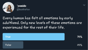 Now, let’s plug in my argument by focusing on the 156 emotions Watt Smith found. I don’t think our emotions would have evolved to that height because due to age and maturation, our experiences haven’t allowed us to feel them. She identified some emotions I feel most humans have never and will never feel.