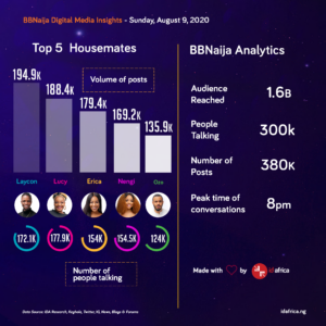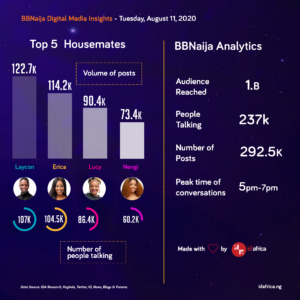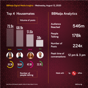 The four weeks of the housemates being in the house has gone by very quickly, but not without its share of conversations, reactions and analysis on social media. The four most talked about housemates have consistently been, Laycon, Erica, Nengi and Ozo. Whichever other housemates these top four relate with the most, or have altercations with, also usually join the top four.
