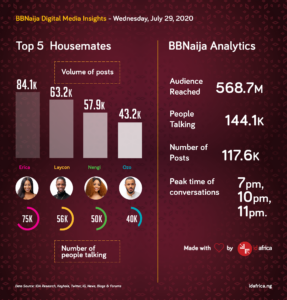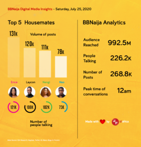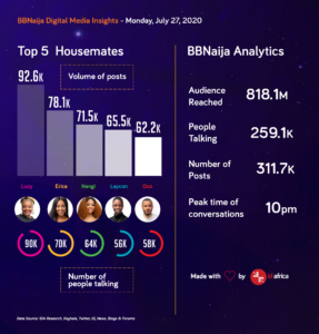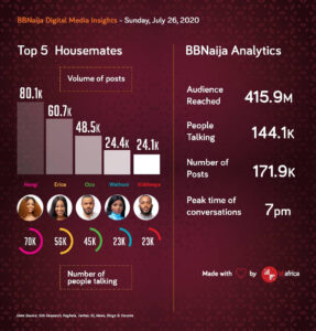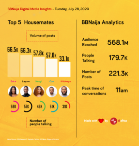 The housemates had an average of 150,000 people talking on social media this week and the names with the highest posts were Nengi, Erica, Laycon, Ozo and Kiddwaya.