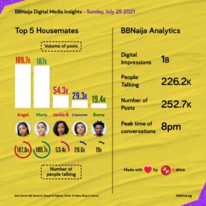 We expected that the ladies will be the centre of social media conversations on Sunday, July 25, 2021, since it was the unveiling of the female housemates. However, Boma made another appearance as one of the five most talked about housemates on that day.