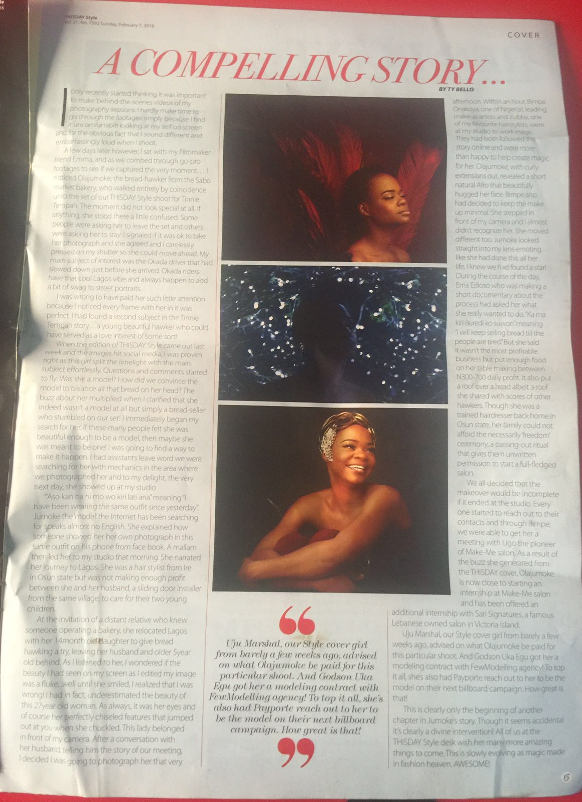 By now, you must have come across the February 7th cover of ThisDay Style, which has Olajumoke Orisaguna on its front cover. In normal circumstances, Olajumoke is the least likely character to cover the front page of the popular magazine. Why? Because some days ago, she was just a bread hawker at Sabo-Yaba, Lagos.