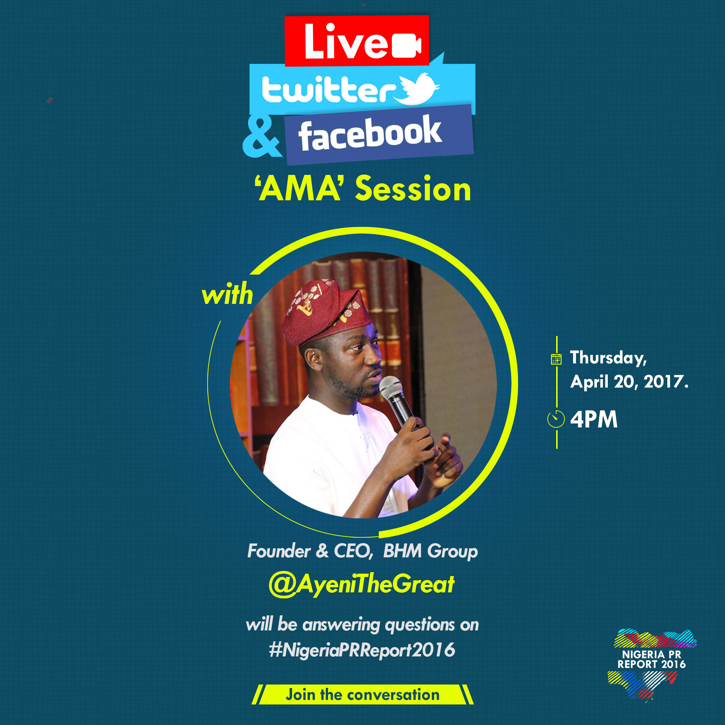 By 4pm today (Thursday, April 20, 2017), Founder and CEO of BHM, Ayeni Adekunle will be responding to questions concerning #NigeriaPRReport2016 via Facebook Live and Periscope (Twitter). We look forward to comments on the report and suggestions for improving future editions.