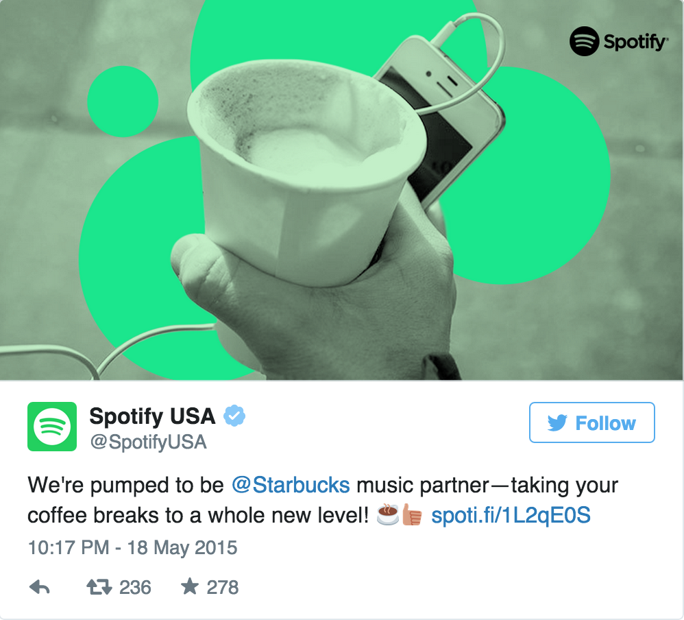 The Spotify/Starbucks partnership means that coffee breaks will not be the same again. Customers at Starbucks now have a say in the music they listen to as they get to pick the playlist mix from Spotify. It’s no longer coffee as usual, more like good music thrown into the mix. Meanwhile it is not all pain no gain for Starbucks, as it will be branding the Starbucks outlets with its promotional materials along with its supply of Music.