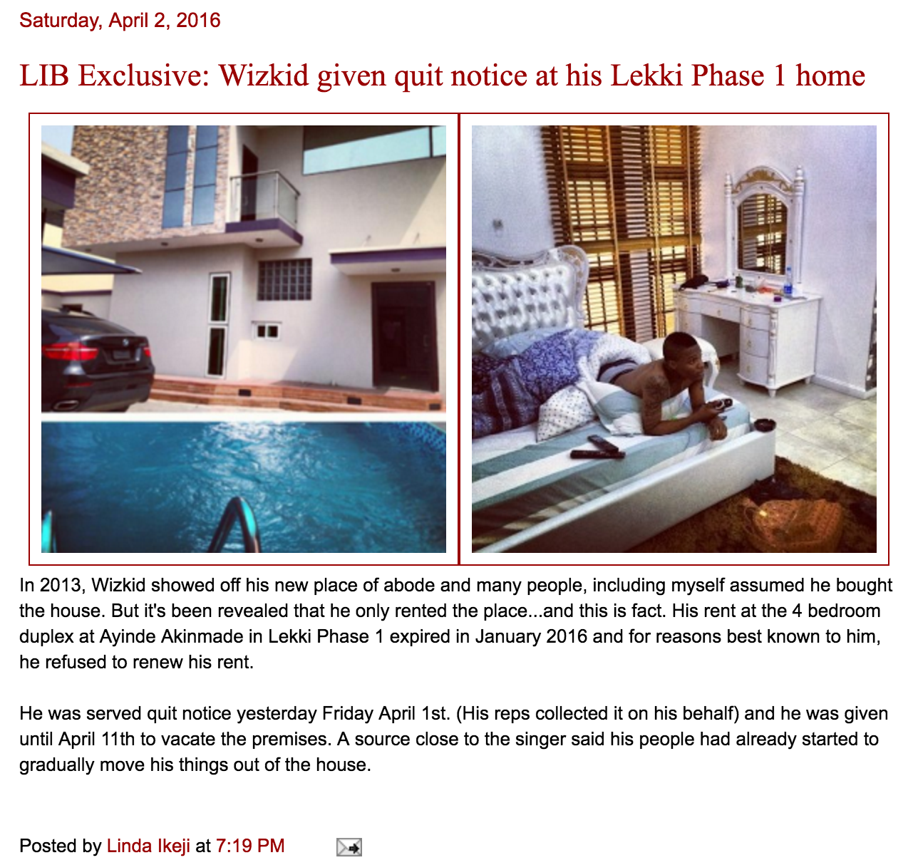 On April 2, 2016, Linda Ikeji posted an exclusive story on how the much loved Nigerian artiste, Wizkid had been given quit notice at his Lagos residence….