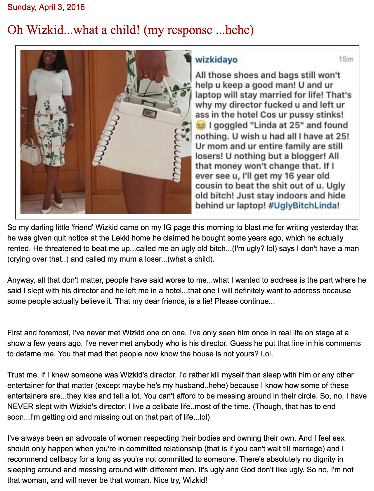 To ‘clear the air’ about her sleeping with his director, Linda Ikeji replied Wizkid…