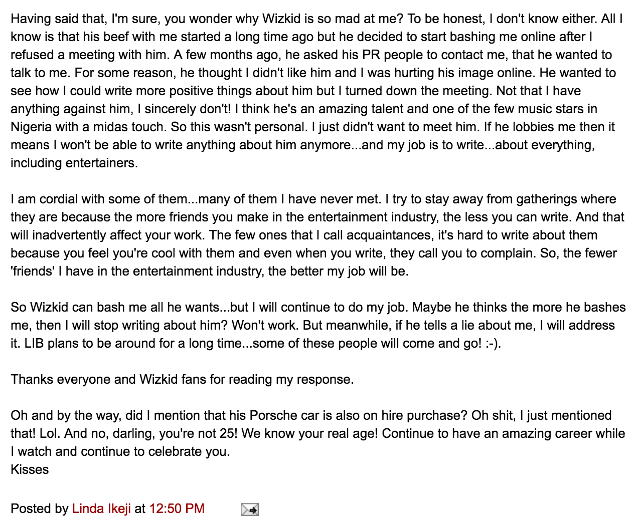 Now, Wizkid’s comment about Linda Ikeji being “nothing but a blogger” is somehow.