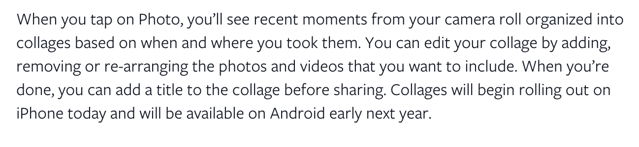 Live streaming is just one of the many cards up Facebook’s sleeves. In the near future, there will be an introduction of Collages, a feature similar to that of Google’s Story on Google Photos. The feature will automatically group photos and videos taken together in an album.