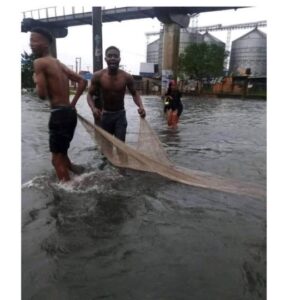 Well, a video of residents who live close to Brick House, Port Harcourt, River State, surfaced last week. The residents were spotted carrying fishing nets while actually fishing in the flood.