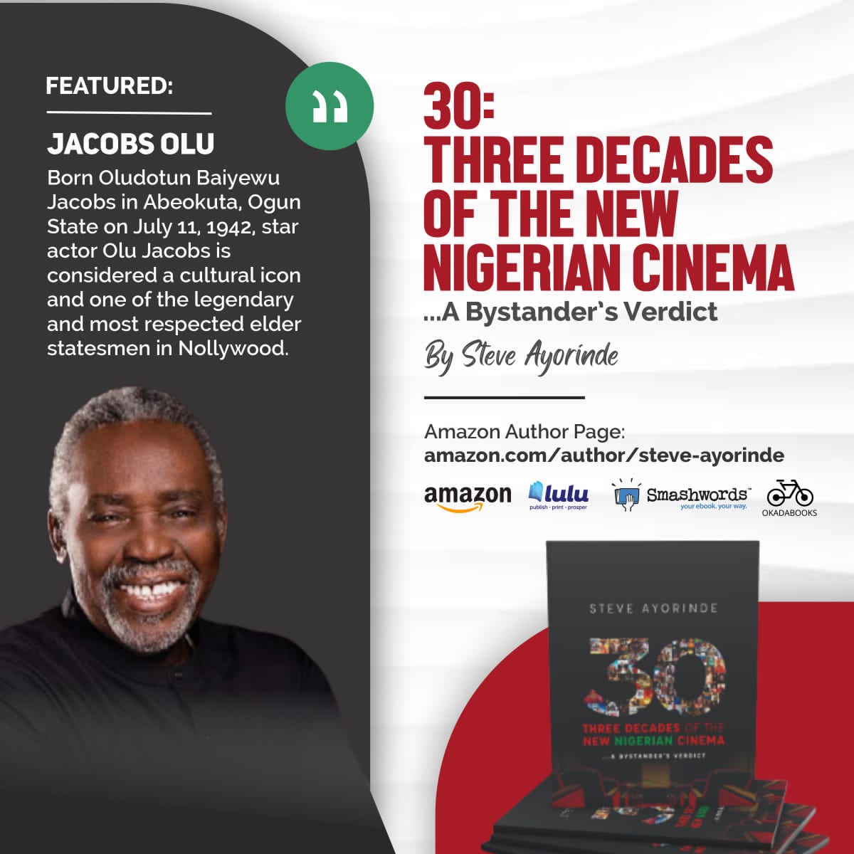 The book, titled ‘30: Three Decades Of The New Nigerian Cinema – A Bystander’s Verdict’, charts three decades of the Nigerian film industry, highlighting thirty (30) outstanding films, directors, actors, actresses and departed Nollywood figures who deserve special recognition for their artistic achievements and impact on the industry’s growth. Having honed his trade as a cub reporter, editor and columnist, editor-in-chief and member of the jury for film festivals, Mr. Ayorinde’s selections in the book are based on close encounters and a deep understanding of the film and cultural landscape of Nigeria.