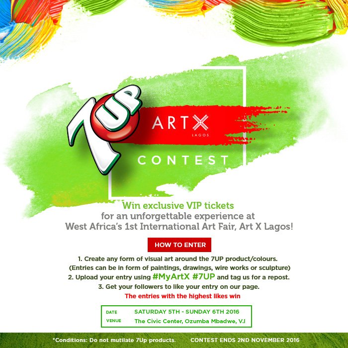 To enter the contest, all you have to do is create an artwork (drawing, painting, and so on) using elements of the 7UP brand, post it using #MyArtX #7UP and also tag @7UP_Nigeria on Twitter or Instagram. Don’t forget to tell your friends to like your artwork, because the entry with the highest number of “likes” wins the N50,000 prize money and VIP pass!