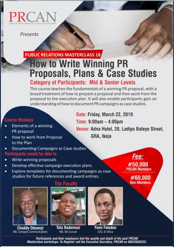 Mr. Femi Falodun, CEO of ID Africa, will be speaking at  a masterclass organized by The Public Relations Consultants Association of Nigeria (PRCAN) themed: How To Write Winning PR Proposals, Plans and Case Studies’.  This will be  happening on Friday, March 22, 2019.