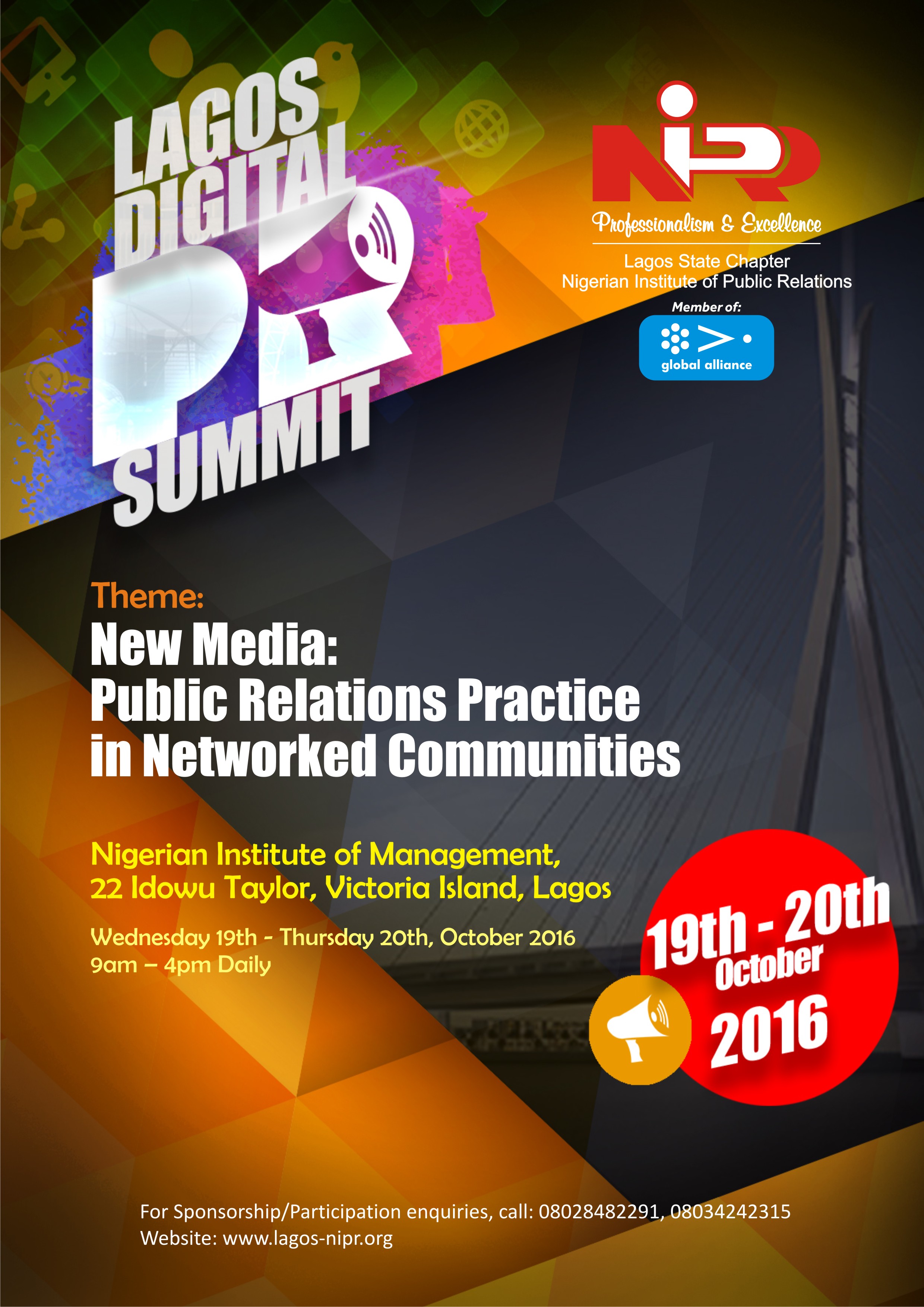 Lagos State Chapter, the flagship branch of the Nigerian Institute of Public Relations (NIPR) is working to achieve collective intelligence to equip and capacitate communicators in corporate and public affairs including bloggers with high-level digital media strategies, tactics and how-to’s so they can do their jobs better and lift their social media campaign results at Lagos Digital PR Summit holding at the Nigerian Institute of Management, 22, Idowu Taylor, Victoria Island, Lagos between Wednesday 19th and Thursday 20th, October 2016 by 9am.