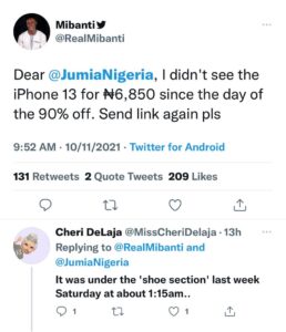 Twitter users have begun looking out for deals in Jumia’s Black Friday sales, with a customer demanding the link to an iPhone 13 device that costs ₦6,850. On Wednesday, November 10, 2021, a customer, Real Mibanti, headed for the popular social media platform, Twitter, to request for a link to one of the most coveted deals on the e-commerce site.