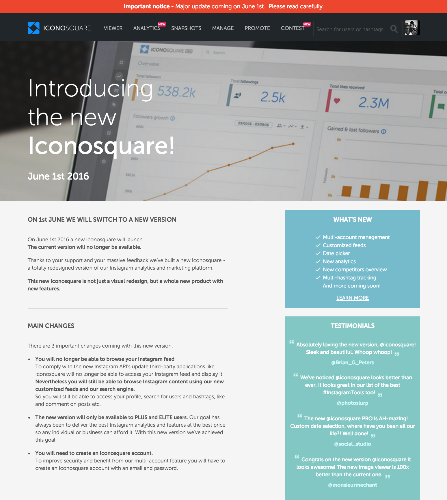 This means one may not have to pay for Instagram third party analytics app, Iconosquare, which is (unfortunately) making its subscription compulsory for all users from June 1, 2016.