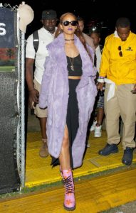 The singer attended day two of the 2015 edition wearing a purple faux fur Marques Almeida jacket that matched her lipstick with bright pink Jeremy Scott combat boots. She wore a matching pair of crop top and slitted skirt that showed a bit of her gorgeous legs underneath.