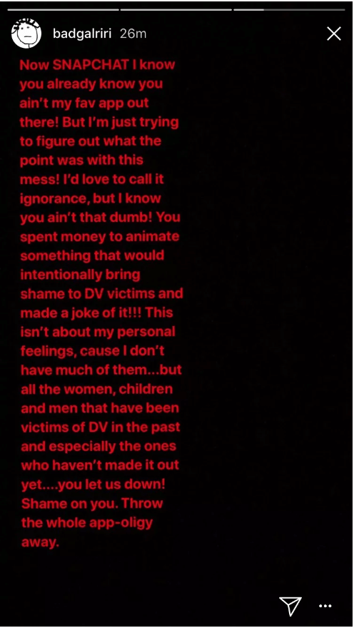 As if that wasn’t enough, in a bid to garner ad revenues, Snapchat started advertising in between the viewer’s stories, but that wasn’t even the baaaad part, a third party ad went ahead to publish a very insensitive ‘game’ that related directly to the assault Rihanna suffered in the hands of Chris Brown.