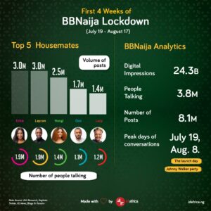Between July 19 and September 23, 2020, the show generated over 55 billion media impressions, with 7.7 million ‘users’ (Twitter accounts) posting the word “BBNaija” over 20 million times on Twitter alone. This is according to data from Keyhole and ID Africa.
